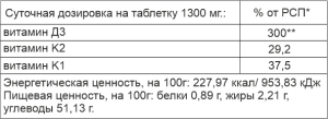 Состав (на таблетку 1300 мг.): Аквамин Ф – порошок литотамнии – 943 мг, целлюлоза микрокристаллическая (агломерирующий агент) – 263,8 мг, поливинилпирролидон (агломерирующий агент) – 25 мг, стеарат магния (антитромбоцитарные средства) – 20 мг, диоксид кремния (антитромбоцитарные средства) – 15 мг, карбокси-метилцеллюлоза натрия (антитромбоцитарные средства) – 13 мг, холекальциферол – 6 мг (в том числе витамин Д3 – 15 мкг), спирулина (краситель) – 5 мг, менахинон – 4,5 мг (в том числе витамин К2 – 0,035 мг), хлорофилл (краситель) – 4 мг, филлохинон – 0,7 мг (в том числе витамин К1) 0,045 мг).